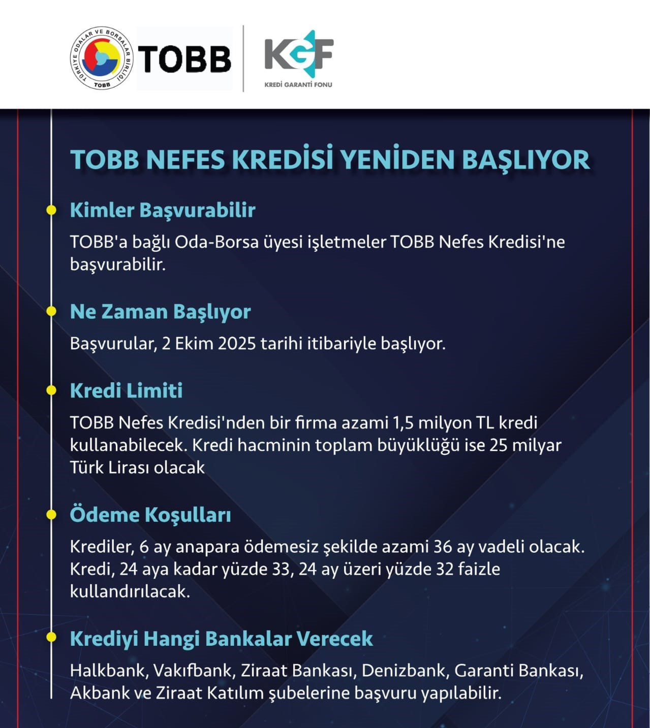 Bu çerçevede, üyeleriniz 02.10.2025 Perşembe günü itibarıyla TOBB Nefes Kredisi işlemlerinde kullanılmak üzere tarafınızca ücretsiz olarak verilecek faaliyet belgesi ile birlikte bahsi geçen bankalara ait şubelerden kredi başvurusunda bulunabilecektir. Birliğimiz ile odalar/borsalar kredi onay süreçlerine iştirak etmeyecek ve referans vermeyecektir.